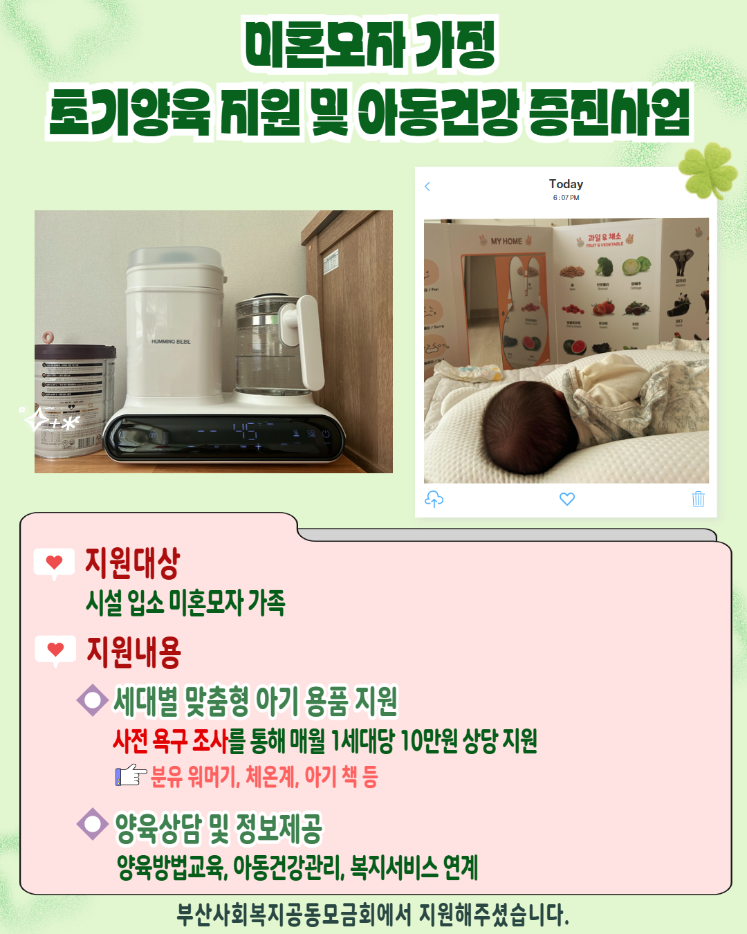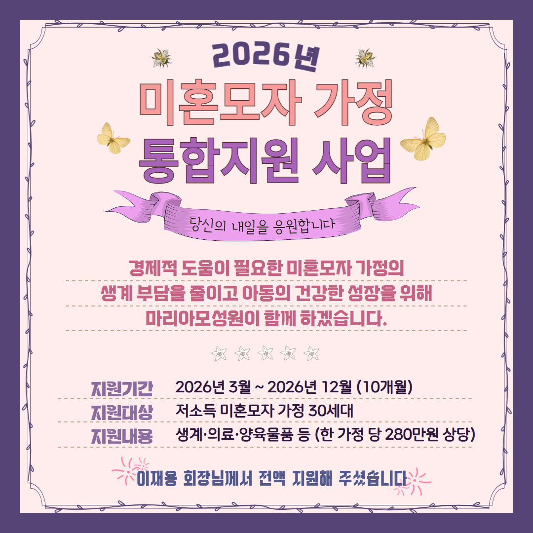 2026년 미혼모자 가정 초기양육 지원 및 아동건강 증진사업 ※ 기저귀, 분유, 젖병, 물티슈, 아기옷 등 기본 아기 양육물품은 위 사업 진행과 상관없이 입소가족에게 항상 제공해드리고 있습니다~^^... 2026-04-03 2026년 미혼모자 가정 통합지원사업 마리아모성원에서는 2026년 3월부터 지역사회에서 생활하는 저소득 미혼모자 가정을 대상으로 생계비, 의료비, 아동양육물품 등을 지원합니다.... 2026-03-24 마리학교 2026학년도 신학기가 시작되었습니다 3월을 맞이하여 마리학교 2026학년도 신학기가 시작되었습니다. 2026-03-11 새해 복 많이 받으세요! 2026년, 새해 복 많이 받으세요! 2025-12-31 << < 1 2 3 4 5 > >> 제목 작성자 내용