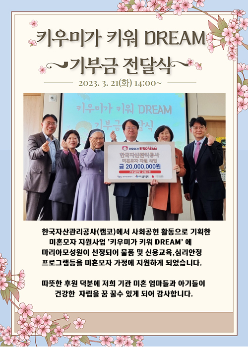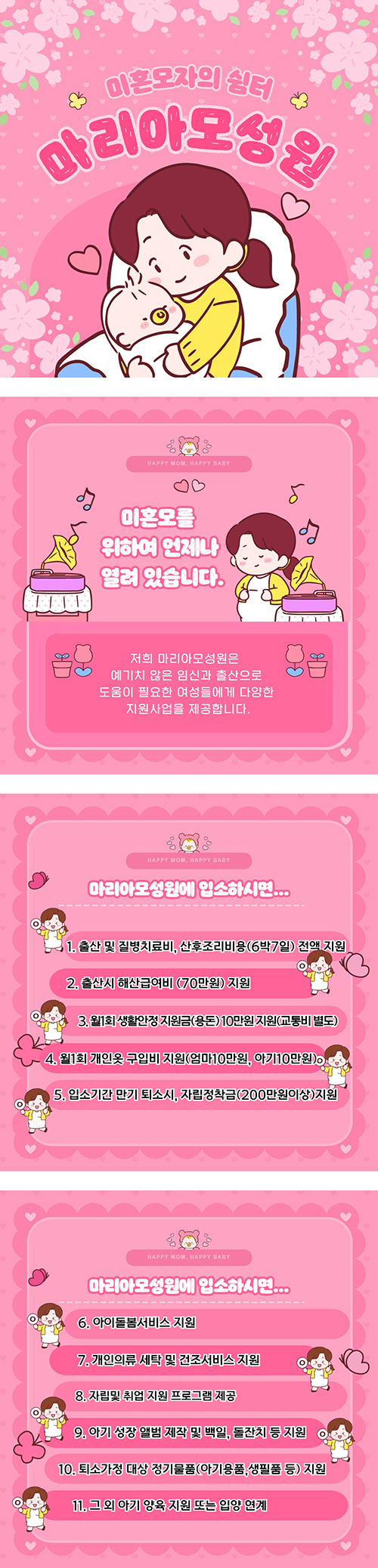 2023 직업체험(가죽공예사) 가죽공예사 직업체험을 다녀왔습니다^^ 2023-07-03 2023년 마리아모성원 지원사업 안내 2023년 마리아모성원 지원사업을 안내드립니다. 저희 마리아모성원은 예기치 않은 임신과 출산으로 도움이 필요한 분들을 대상으로 다양한 지원사업을 진행하고 있습니다. 1.출산 및 질병치료비, 산후조리비용(6박7일) 전액 지원 2.출산시 해산급여비 (70만... 2023-06-29 2023년 한국자산관리공사 사회공헌 사업 따뜻한 후원에 진심으로 감사드립니다. 2023-03-22 마리아모성원 백일잔치 2023년 3월 15일 사랑스러운 솔이의 백일잔치가 있었습니다. 귀엽고 소중한 솔아, 지금처럼 건강하고 예쁘게 잘 자라길 바래! ... 2023-03-17 << < 6 7 8 9 10 > >> 제목 작성자 내용