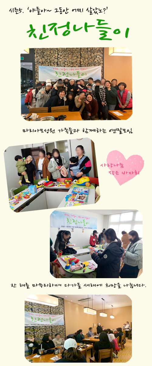 자립지원모임. 시즌5. 2020-2-7 야들아, 그동안 어찌 살았노? '친정나들이' 프로그램으로 마리아모성원 가족들의 자립지원모임을 가졌습니다. ... 2019-12-30 직업체험프로그램 '네일아티스트' 2019-02-10 직업체험프로그램 '네일아티스트' 일일체험을 다녀왔습니다. 2019-12-30 직업체험프로그램 '은공예지도사' 2019-3-20 직업체험프로그램 '은공예 지도사' 일일체험을 다녀왔습니다. 2019-12-30 백일잔치~^^ 2019년 8월 23일 백일을 앞둔 은이의 조금 이른 백일잔치가 있었습니다. 2019-07-25 << < 16 17 18 19 20 > >> 제목 작성자 내용