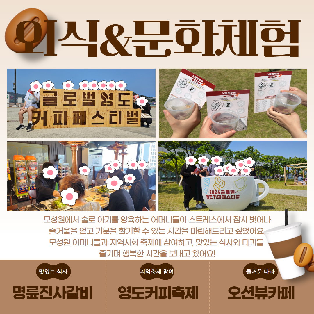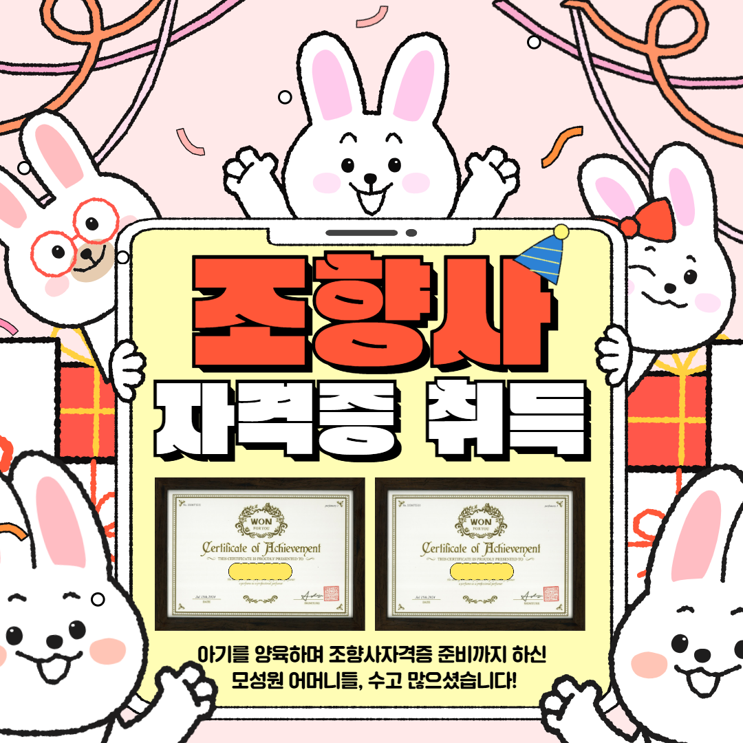 2024 가족여행2 천주교 서울대교구 생명위원회의 지원을 받아 1가정이 행복한 가족여행을 다녀왔습니다. 2024-08-19 축! 어머니들의 조향사자격증 취득 모성원 어머니들이 조향사자격증 취득을 목표로 열심히 공부하여 시험에 합격하였습니다. 꿈을 위해 열심히 공부하신 어머니들! 축하합니다~^^... 2024-08-18 마리아모성원 백일잔치 2024년 6월 19일 사랑스러운 아기의 백일잔치가 있었습니다. 사랑스럽고 소중한 아기야, 지금처럼 건강하고 예쁘게 잘 자라길 바래!... 2024-06-29 2024 문화체험 2024 문화체험을 다녀왔습니다. 2024-05-24 << < 1 2 3 4 5 > >> 제목 작성자 내용